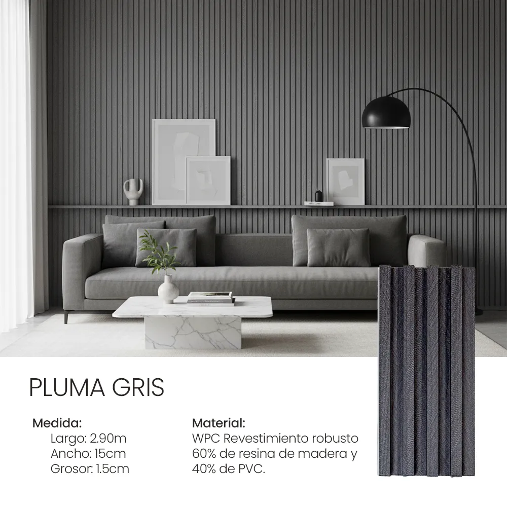 Fabricado con una mezcla de 60% resina de madera y 40% PVC, este panel para interiores cuenta con un acabado premium que reproduce con gran realismo las texturas naturales y colores sólidos, adaptándose fácilmente a cualquier estilo de decoración moderna o clásica.
